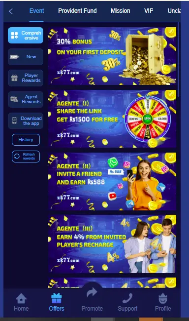 Bring friends to ZK 77 and get bonus money for each. Your friends also get free starting money when they join. You get 10% of your friend’s money forever automatically. More friends means more money every month for you. Many people make 5000 rupees monthly just from friends.
